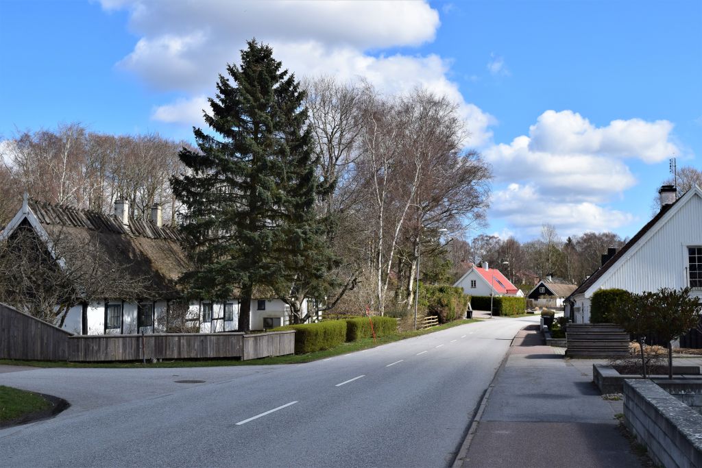 Snart tar leden oss ut ur skogen och vi fortsätter vår vandring genom Blentarp, förbi kyrkan och ner mot en vägkorsning.