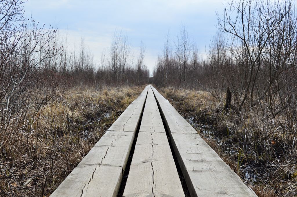 Efter ett par kilometer lämnar vi de andra lederna och fortsätter vidare längs spänger över mossen. Precis vad vi längtat efter. Att vandra längs spänger är något av det roligaste som finns vandringsmässigt tycker vi.