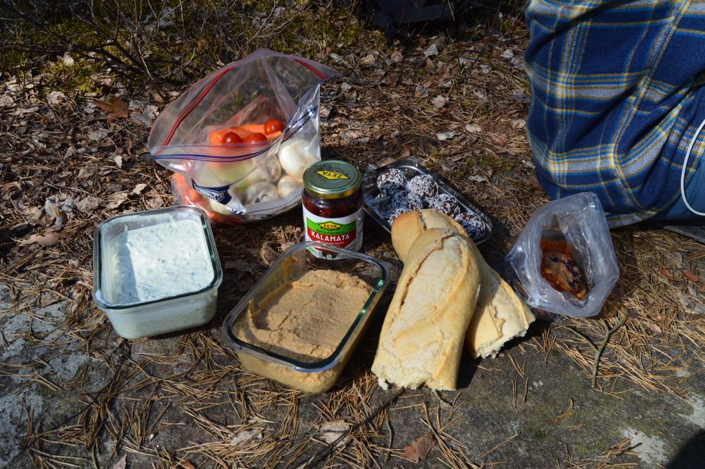 Hungriga som vi nu är tar vi oss inte tid att leta upp något bättre picknickställe i skogen. En solig sten duger gott att packa upp våra godsaker på. För att sitta vid picknickborden är inte att tänka på. Inte nu med tanke på de överfulla parkeringsplatserna vid naturum.
