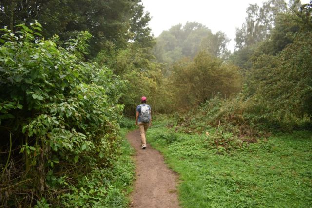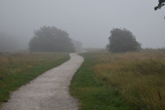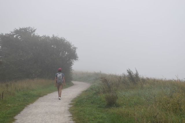 Vandring på asfalterade cykelvägar är aldrig kul, men med omgivande fält insvepta i dimma och det faktum att det är sparsamt med trafik på vägen bredvid så måste vi ändå erkänna att det är en ganska trevlig vandring trots allt.