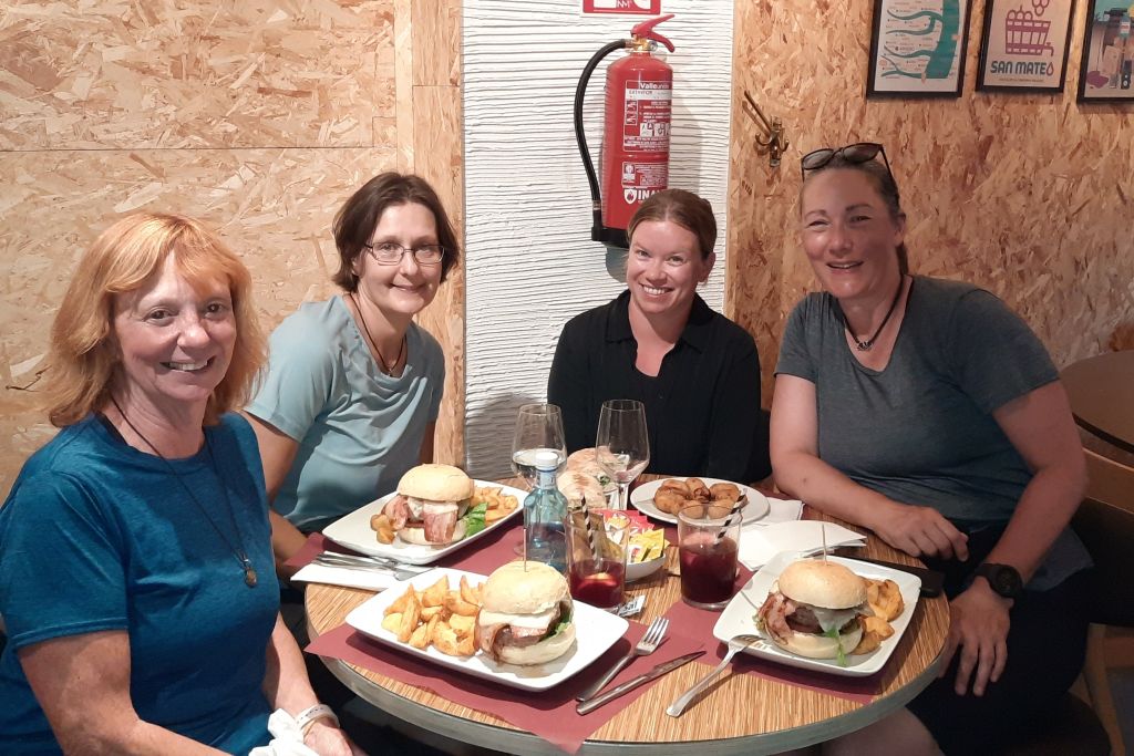 Några caminovänner sms:ar och frågar om jag vill följa med ut och äta. Det vill jag förstås. Både god mat och trevligt sällskap står högst upp på önskelistan denna kväll. Det visar sig dessutom att de bor på samma albergue, så snart träffas vi och ger oss ut för att hitta ett lämpligt ställe att äta på.