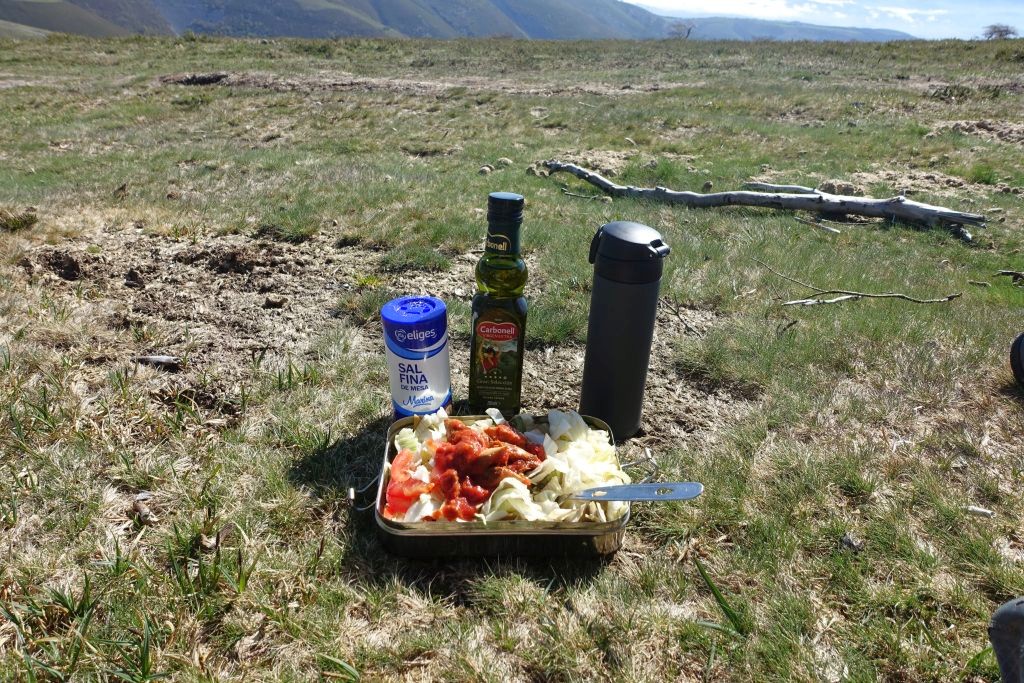 När vi kommer uppför backen slår vi oss ner framför den fina utsikten och dukar fram lunch. Sallad med makrill, salt och olivolja. En kopp te. Våra holländska caminovänner tycker vi borde addera ett glas vin till måltiden, men där går vår gräns för vad vi orkar packa ner i ryggsäcken.