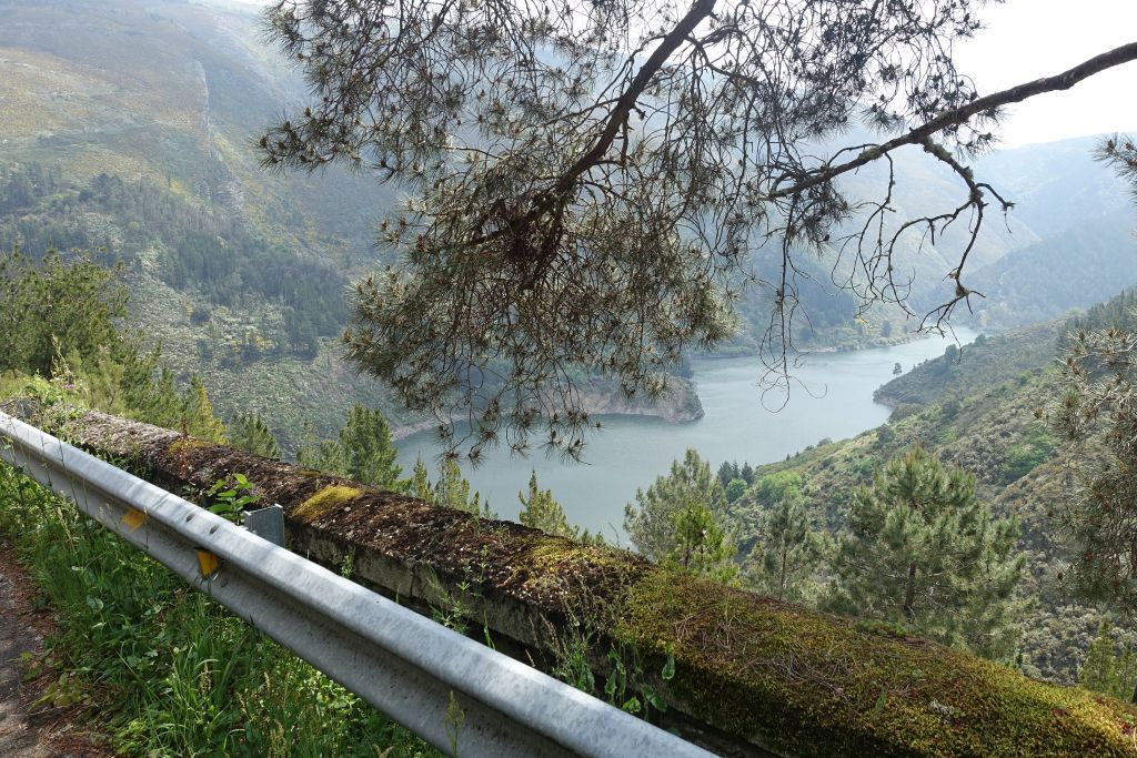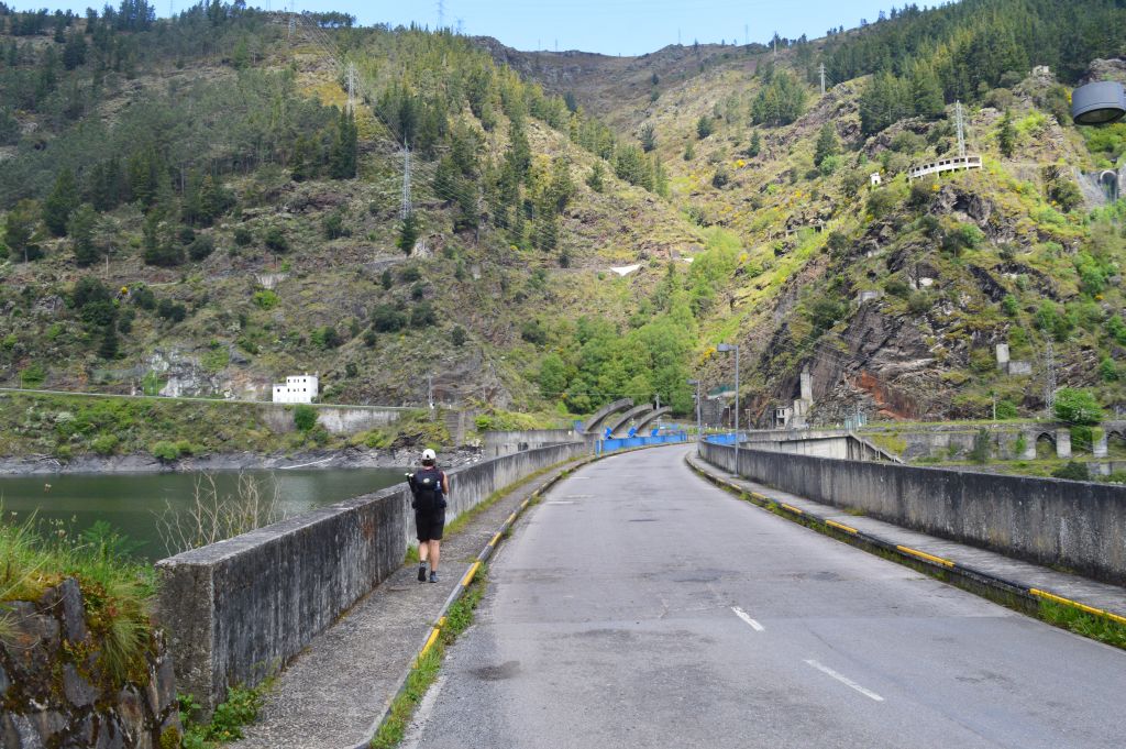 En bro över floden Navia leder oss sen vidare längs landsvägen upp till Las Grandas Hotel. Här stämplar vi våra pilgrimspass och äter lunch framför utsikten över dammen.