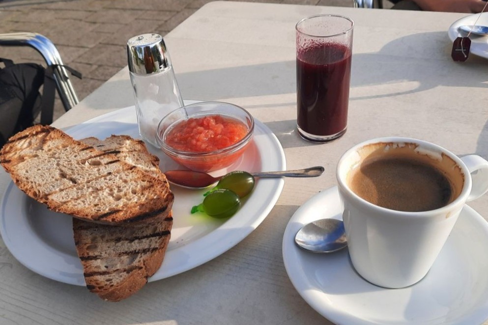 Det här måste ju vara caminons bästa frukost. Juice från nyplockade blåbär, toast med tomat och olivolja och så en kopp riktigt gott kaffe. En sol som håller på att gå upp över bergen och glada pilgrimer som kommer och går.