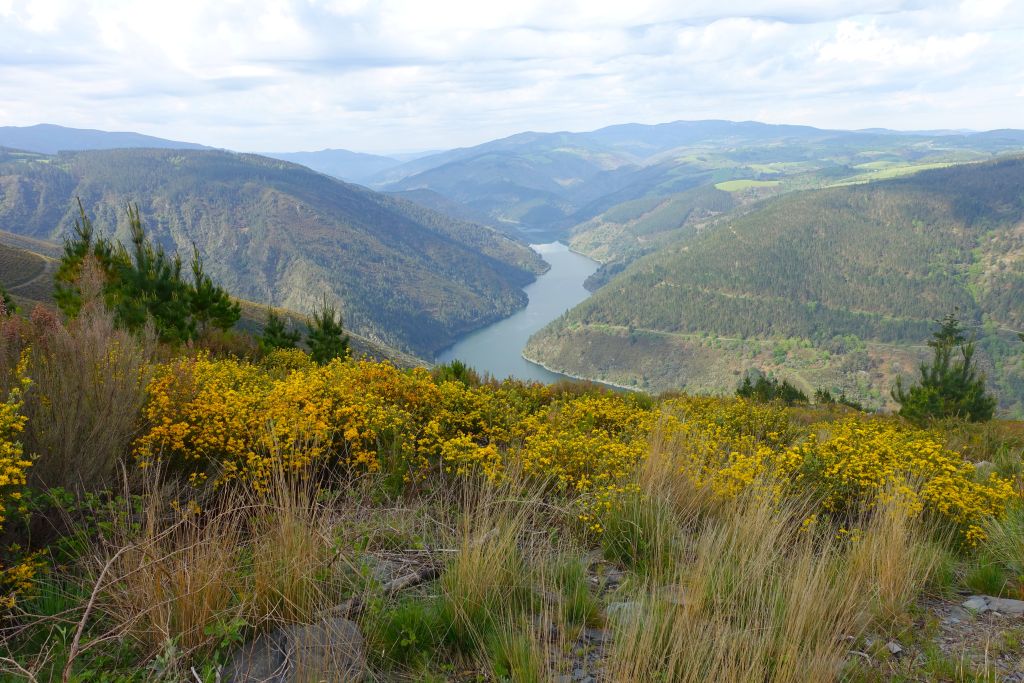 När vi kommer ner till Mirador del Embalse (787 m) får vi en första skymt av Salime-reservoaren nedanför.