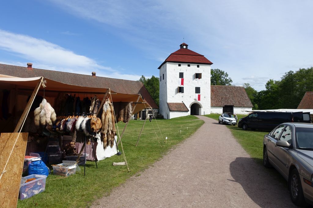 Hela slottsgården är full av människor som förbereder inför de kommande Medeltidsdagarna. Smycken, djurhorn och fårfällar packas upp bland stånden. Utsmyckade hästar och ryttare tränar inför Riksturneringen i paddocken bredvid. Det är en riktigt glad och festlig stämning på hela området.