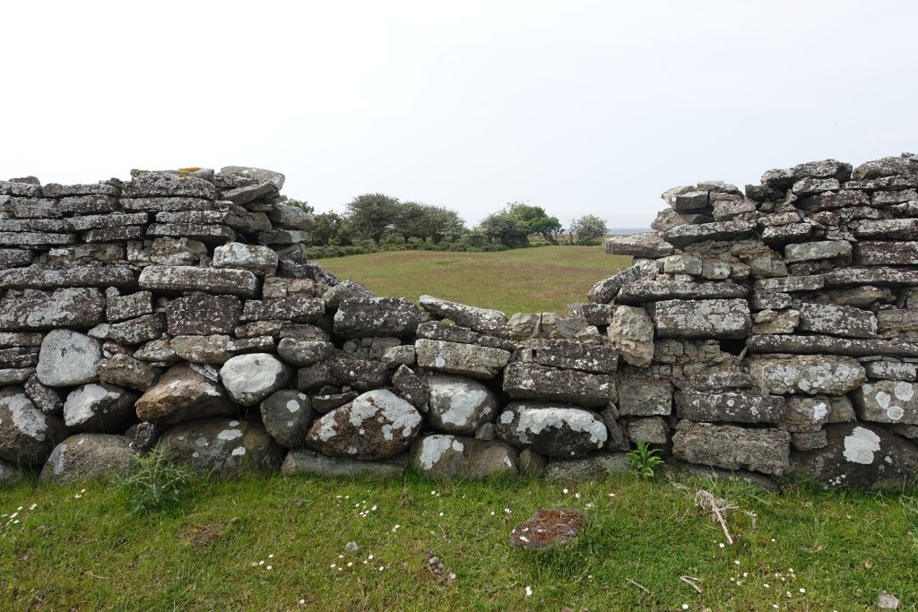 När vi kommer fram till Karl X Gustavs mur, den mur som byggdes på 1650-talet för att markerar gränsen för kungsgårdens mark, viker leden av från havet och vi fortsätter nu längs muren.