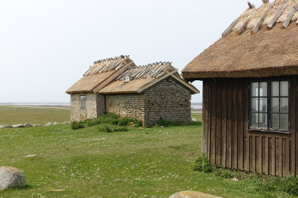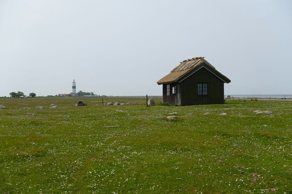 När vi når fram till Hahns fiskarestugor ser vi fyren Långe Jan framför oss.