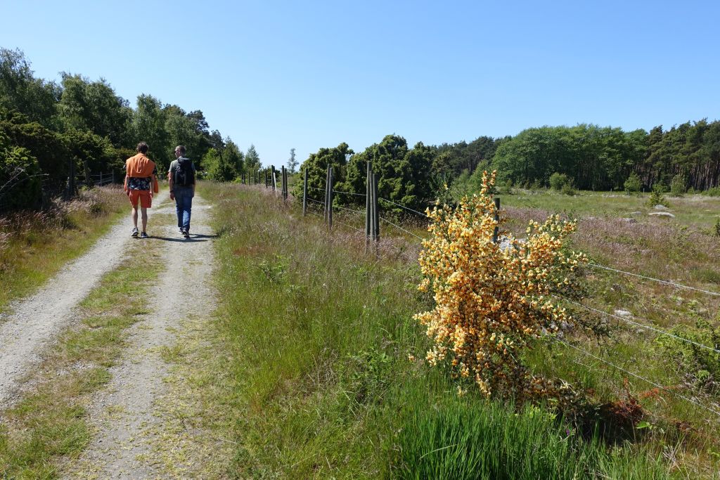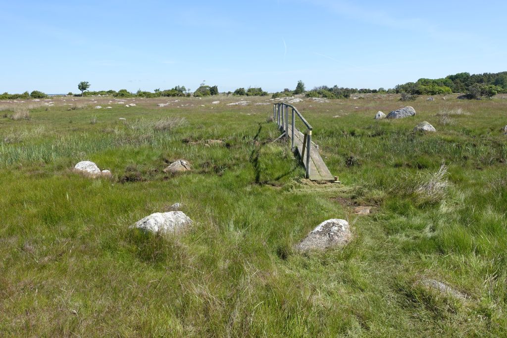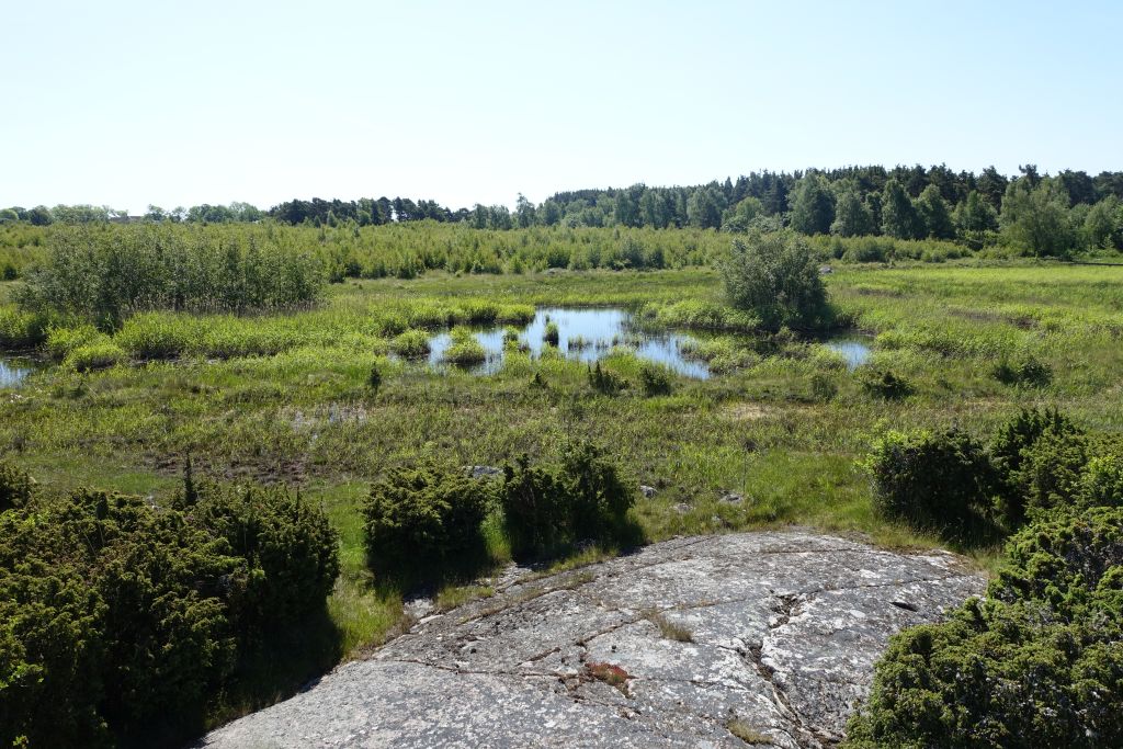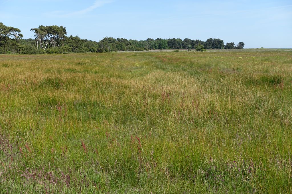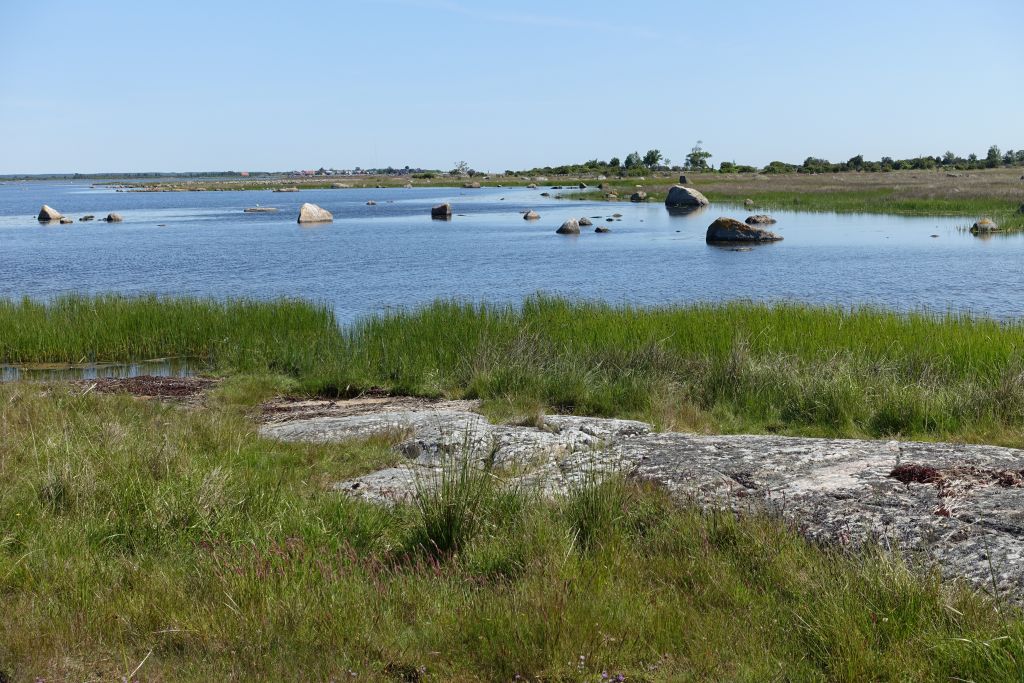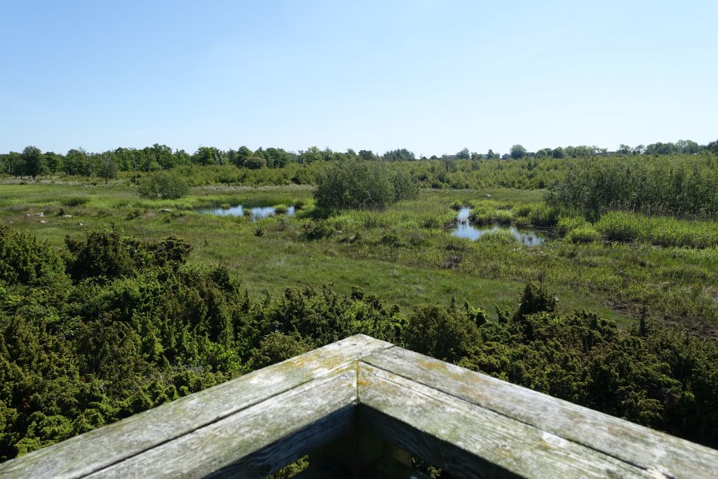 Vi svänger av stigen för att ta oss en titt på utsikten från utkikstornet innan vi sen fortsätter över strandängarna. Dessa och de omgivande våtmarkerna utgör en viktig plats för häckande fåglar och ön är därför en populär plats för ornitologer.
