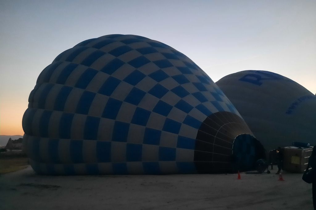 När vi kommer fram håller vår ballong på att fyllas med luft. Det är fortfarande mörkt ute, men det väsande ljudet vittnar om vad som är på gång.