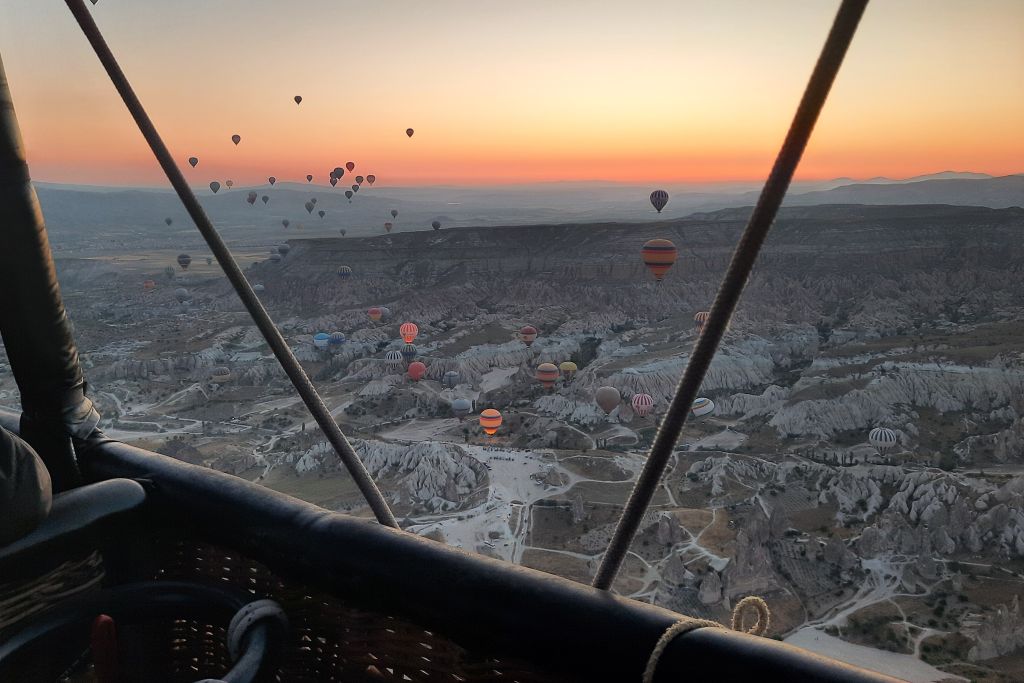 En halv kilometer upp i luften ska vi. Tillsammans med ett hundratal andra ballonger. Özur berättar att det är runt 150 ballonger uppe varje morgon.