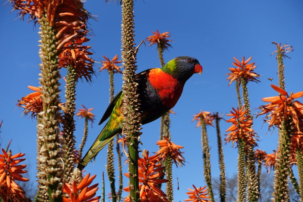 Eftersom det är vinter är det inte mycket som blommar, men en rabatt med färgglad aloe vera får oss att stanna till. Det är då vi ser dem, papegojorna som flyger omkring bland blommorna på jakt efter något gott att äta.