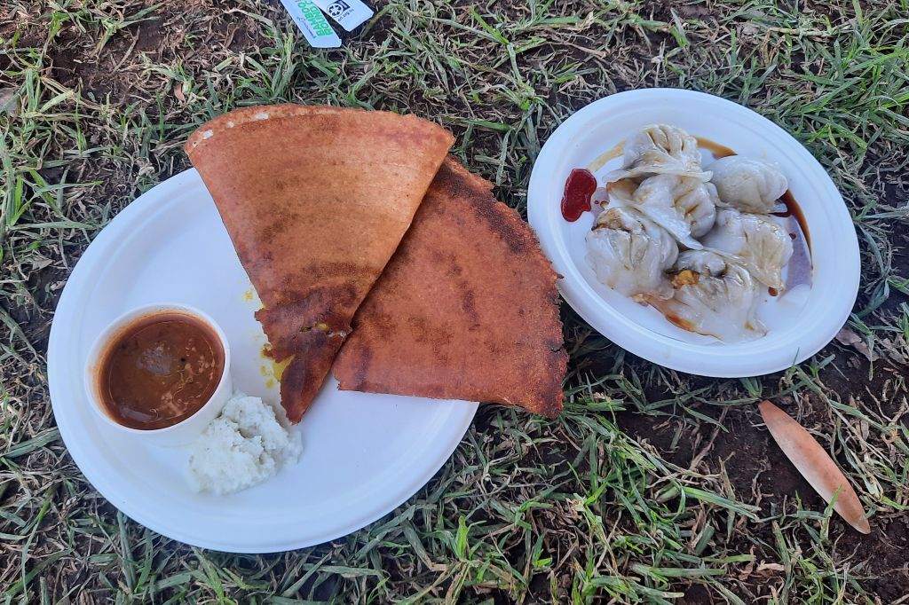 Vi slår till på en tallrik indisk dosa och ett gäng vietnamesiska dumplings och slår oss sen ner i gräset tillsammans med resten av besökarna för att njuta av godsakerna och den härliga stämningen.
