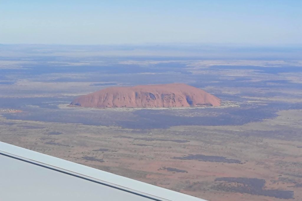 När vi påbörjar vår inflygning ser jag Uluru resa sig över det röda ökenlandskapet. En riktigt mäktig syn.