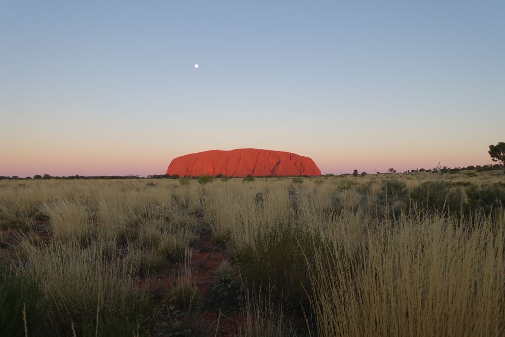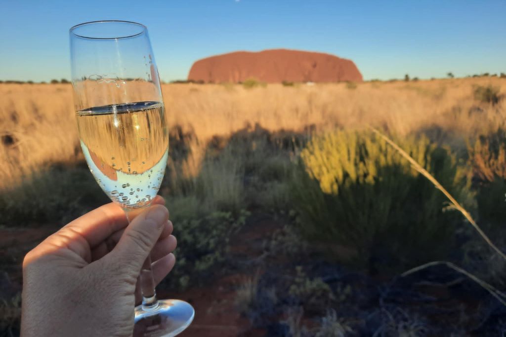 När vi kommer fram till utkiksplatsen bjuds vi på bubbel och godsaker. Solen håller på att gå ner bakom oss och gör att Uluru långsamt skiftar färg från gyllene till mörkbrun. En fullmåne kikar fram ovanför klippan och det är varmt, soligt och alldeles underbart.