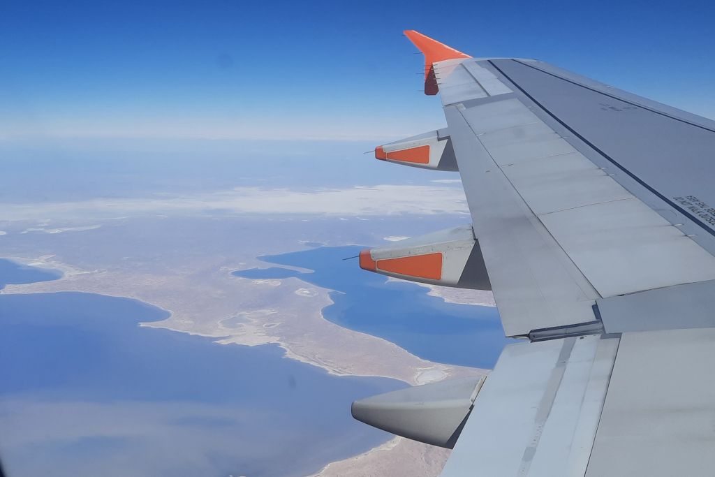 Från luften uppmärksammar piloten oss på att vi flyger över Australiens största sjö, Lake Eyre, som nu för första gången sen år 1974 är helt vattenfylld. Något som tydligen bara händer ett par gånger varje århundraden.