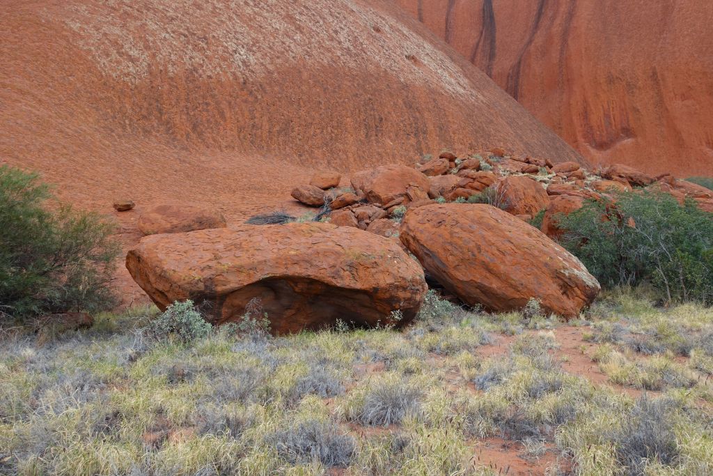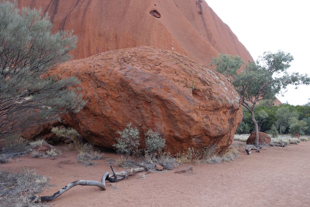 Två timmar har hela varvet runt Uluru tagit oss. Det är också nu vi tittar lite mer noggrant på kartans vandringsinformation. Det visar sig vandringen beräknas ta mellan 3-5 timmar, inte 1 ½ timme som vi båda tycks oss ha läst på kartan. Så att hinna med första bussen tillbaka hade varit en omöjlighet.