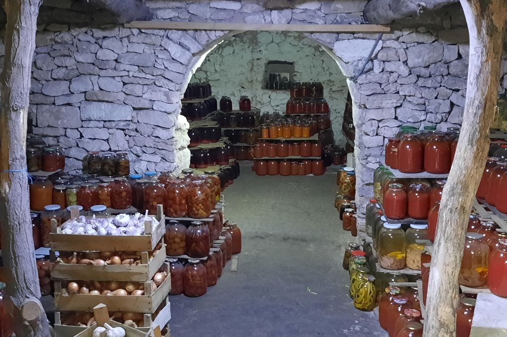 Här får vi kika in i restaurangens matkällare och se på när en kvinna tillreder olika inläggningar.