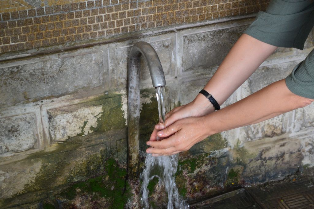 Innan vi går in på klosterområdet visar Svetlana oss hur man gör en reningsritual enligt den ortodoxa tron. Först en ordentlig handtvätt och så ett par rejäla klunkar av vattnet som avslutning.