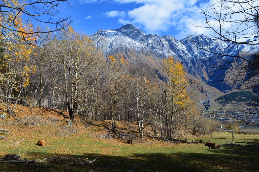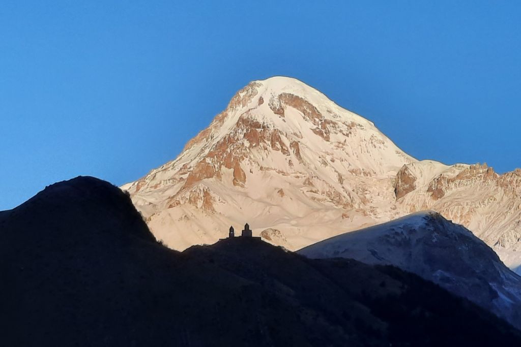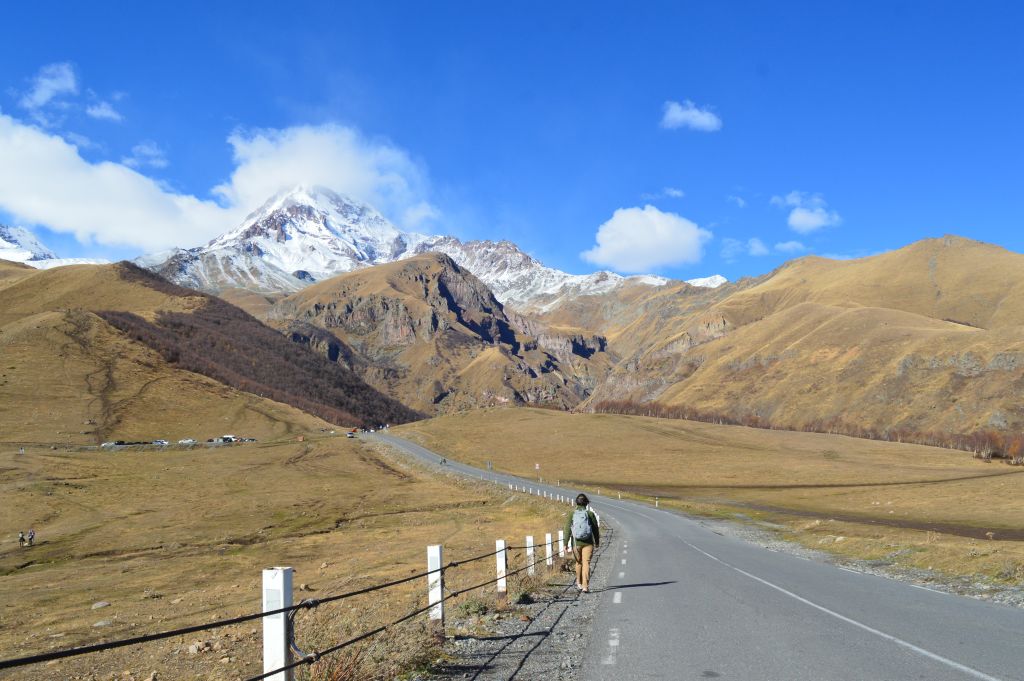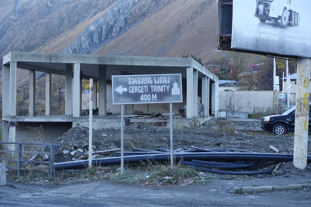 Planen från början är att vandra till Gergeti Glacier, men det visar sig att vi kommer för sent på året för att ta oss an denna krävande vandring. Snön har redan börjat att falla i bergen och det blir mörkt redan vid 18-tiden.