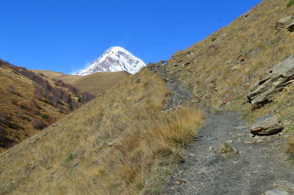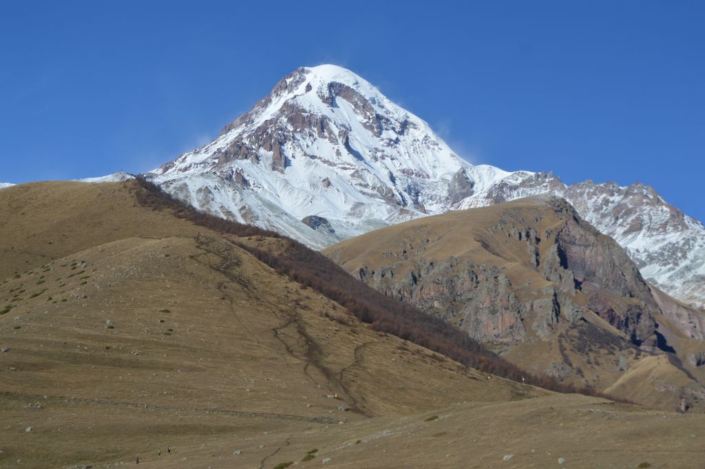Framför oss tornar nu Mt Kazbek (5054 m) upp sig med sin snöklädda topp. Enligt den grekiska mytologin var det här som Prometheus kedjades fast för att ha utmanat gudarna och stulit elden till människorna.
