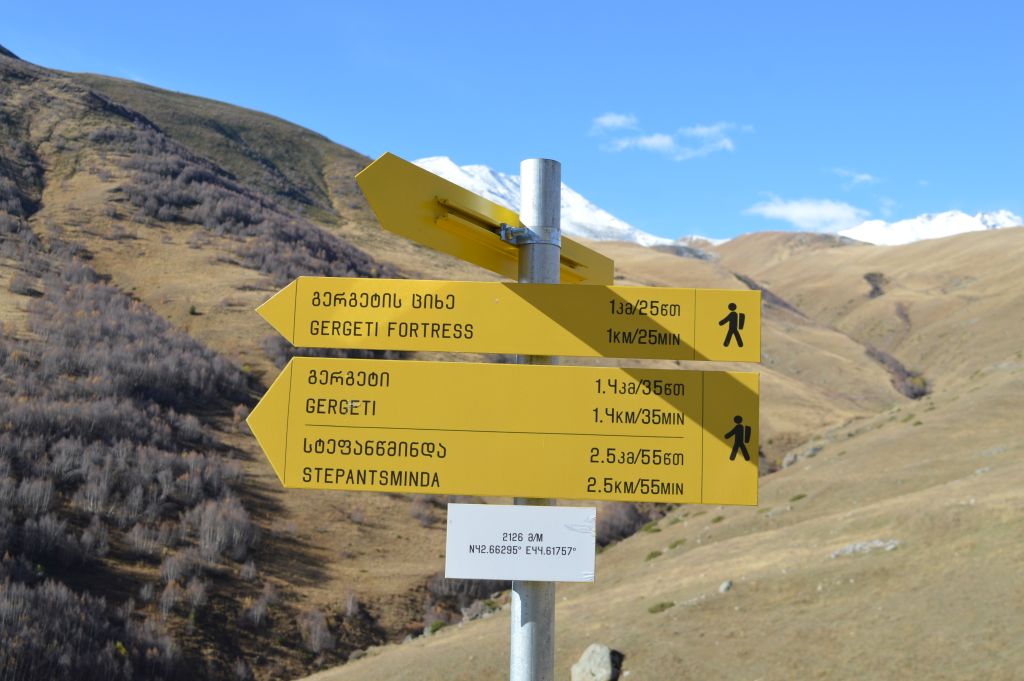För att slippa vandra samma väg fram och tillbaka väljer vi att vandra den 6 km långa rundslingan Gergeti Circular, en led som startar i byn Gergeti ett par kilometer utanför Stepantsminda.