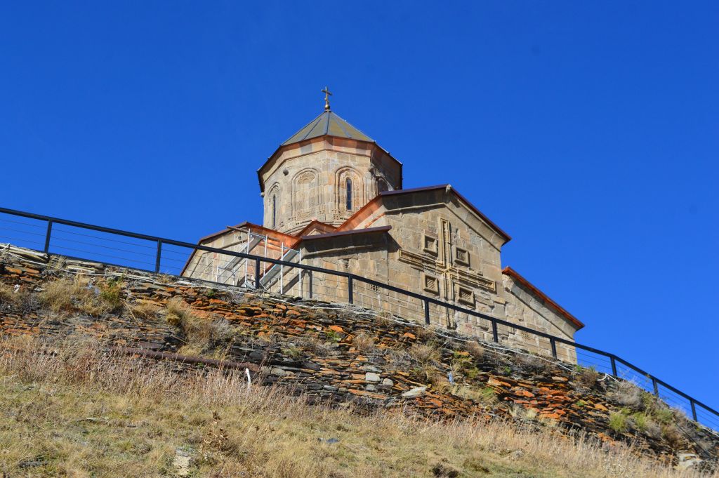 Med tanke på den sparsamma mängden vandrare på leden skulle man ju kunna tro att vi är ensamma när vi kommer upp till kyrkan. Men så är tyvärr inte fallet. En bilväg som leder från Gergeti upp till kyrkan gör det möjligt för både bussar och bilar att lämna av en större mängd besökare.
