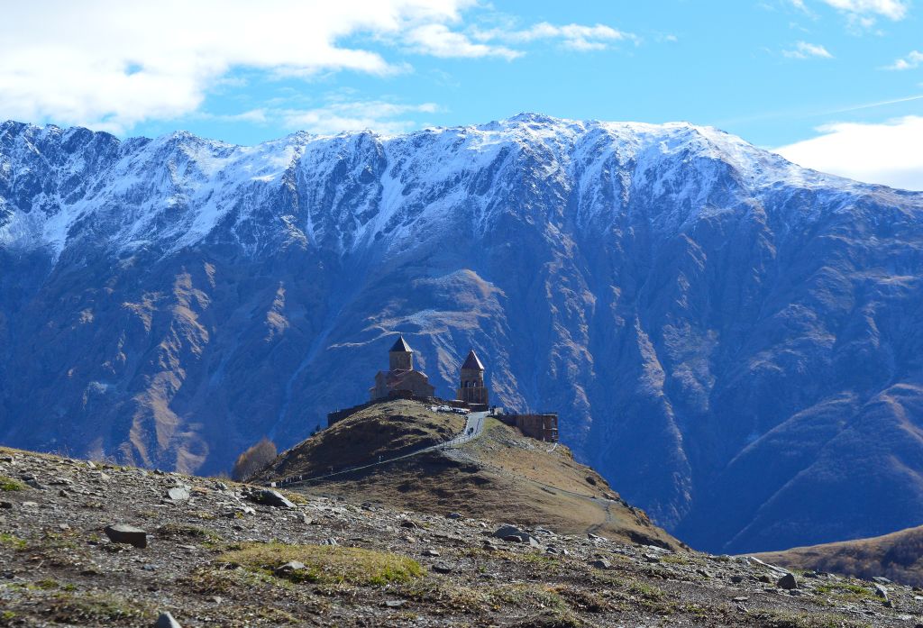 Snart ser vi baksidan av Gergeti Trinity Church, kyrkan som byggdes på 1300-talet som en symbol för landets motståndskraft och som i dag är ett av Georgiens mest kända landmärken.