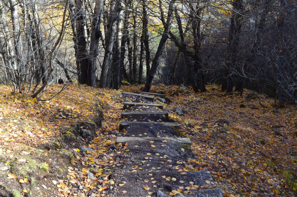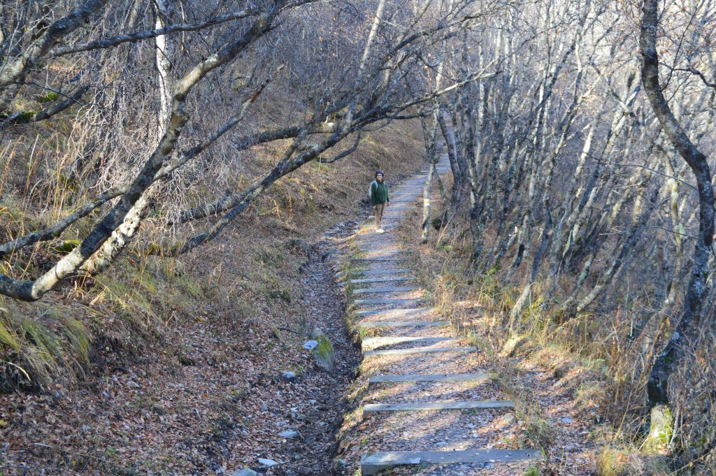 Branta trappsteg tar oss ner genom en skog. Det ser ut som vi kommer några veckor för sent, här har de flesta löv har redan ramlat av träden.