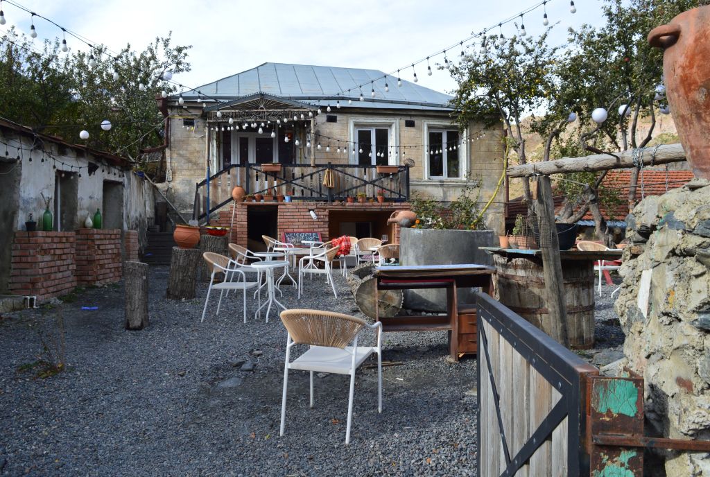En man utanför restaurang House lockar in oss på utegården. Vi beställer ett fat med bergsostar och grillade champinjoner och sköljer ner godsakerna med ett glas georgiskt vin.