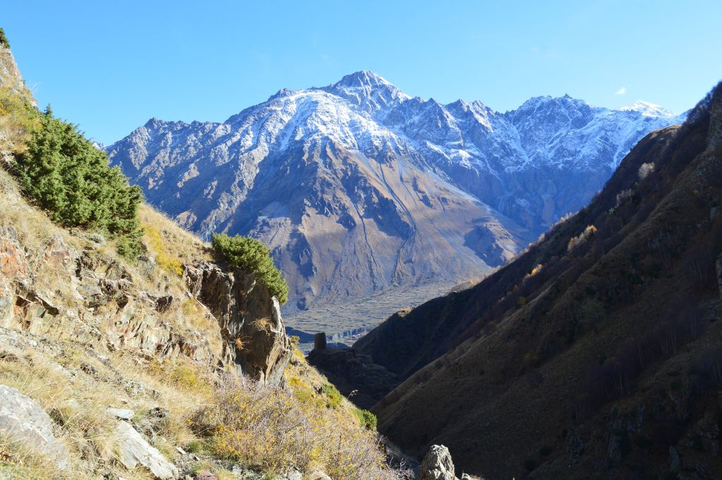 Planen från början är att vandra till Gergeti Glacier, men det visar sig att vi kommer för sent på året för att ta oss an denna krävande vandring. Snön har redan börjat att falla i bergen och det blir mörkt redan vid 18-tiden.