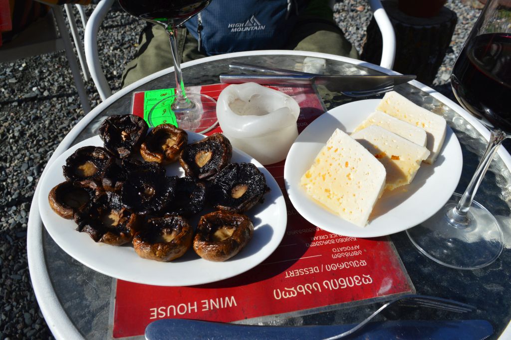 En man utanför restaurang House lockar in oss på utegården. Vi beställer ett fat med bergsostar och grillade champinjoner och sköljer ner godsakerna med ett glas georgiskt vin.